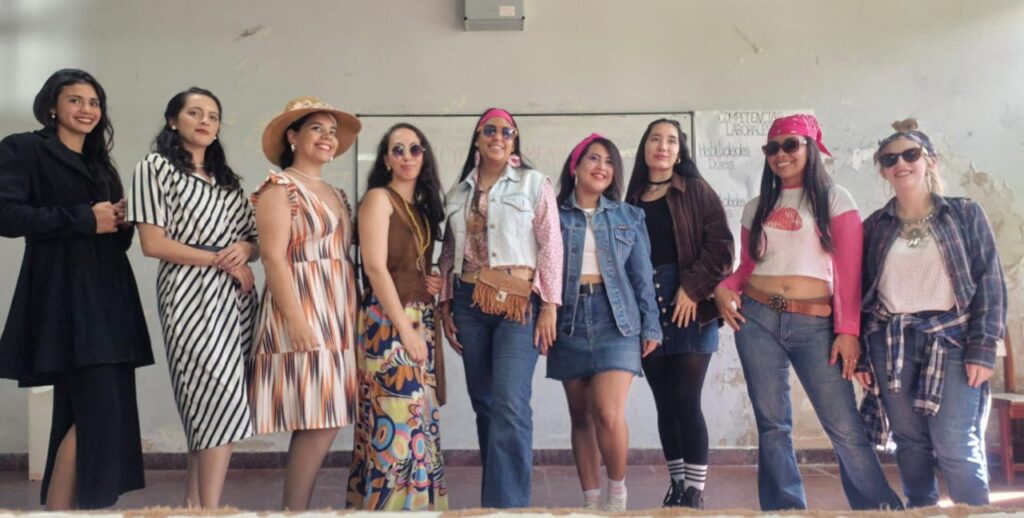Las alumnas graficaron los cambios sociales a través de la moda femenina desde los años 30 hasta la actualidad: ropa, calzados, peinados, accesorios, maquillaje, música, influencias y contextos históricos.